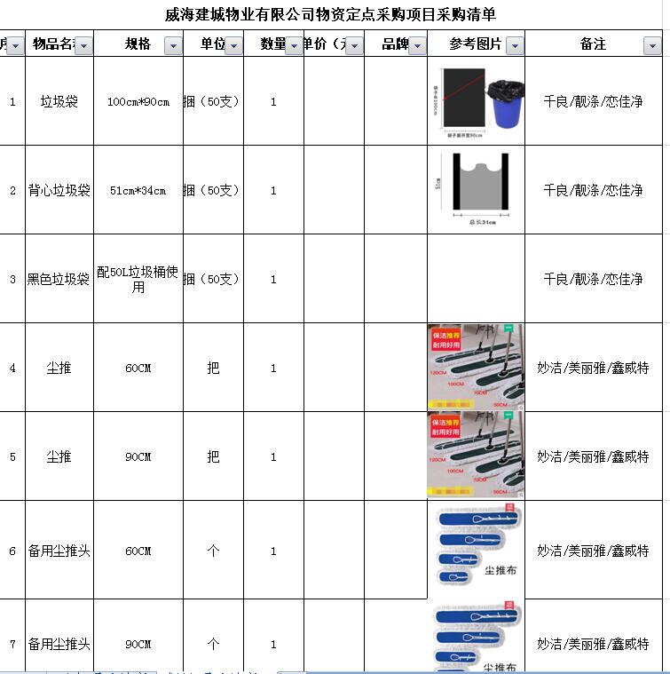 (5)采購內(nèi)容:威海建城物業(yè)物資定點采購,主要包括五金、水暖管件、保潔、維修、綠化所需物資、應(yīng)急維修的其他物資等,采購清單詳見附件。